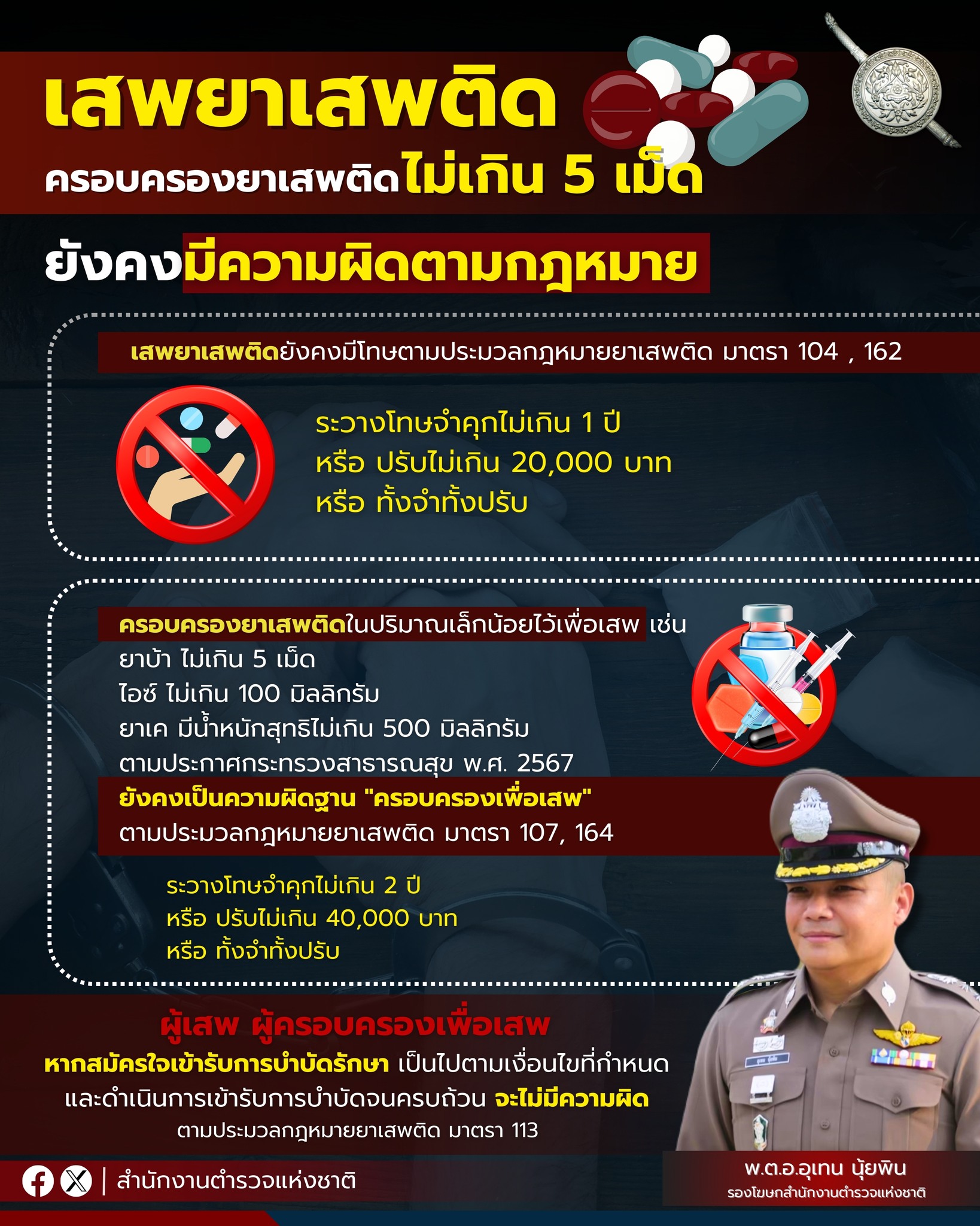 การเสพยาเสพติด การครอบครองยาเสพติดไม่เกิน 5 เม็ด ยังคงมีความผิดตามกฎหมาย มีโทษทั้งจำทั้งปรับ!! ขอเรี