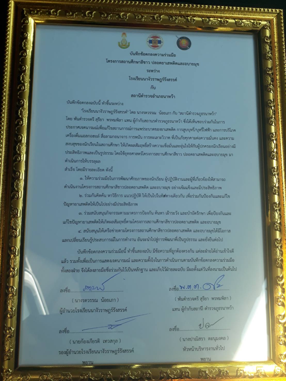 MOU สถานศึกษาสีขาว ปลอดยาเสพติดและอบายมุข 8 กุมภาพันธ์ 2567 โดย adminnawa / ภารกิจ การปฏิบัติหน้าที่ วันนี้ 8 ก.พ. 2567 เวลา 09.00 น. พ.ต.ต.สุริยา พรหมพิลา สวป.สภ.นาหว้า และ ร.ต.ต.ประดิษฐ์ ศิลารักษ์ รอง สว.(ป.)สภ.นาหว้า ร่วมลงนามบันทึกข้อตกลงความร่วมมือ MOU สถานศึกษาสีขาว ปลอดยาเสพติดและอบายมุข พร้อมให้ความรู้เรื่องยาเสพติด จราจร และกลโกงทางออนไลน์ แก่คณะครู นักเรียน โรงเรียนนางัวราษฎร์รังสรร FacebookFacebookXXLINELine