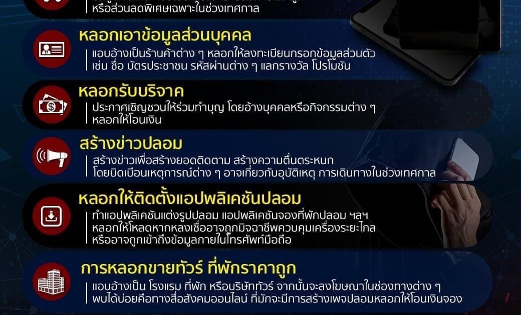 ระวัง 6 ภัยออนไลน์ 28 ธันวาคม 2566 โดย adminnawa / ข่าวประชาสัมพันธ์ ระวัง 6 ภัยออนไลน์ช่วงส่งท้ายปีเก่า ต้อนรับปีใหม่ FacebookFacebookXXLINELine